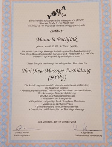 Durch den Wunsch auf neues, habe ich im Sept. 2025 die Thai-Yoga-Massage-Ausbildung bei Yoga-Vidya absolviert.
